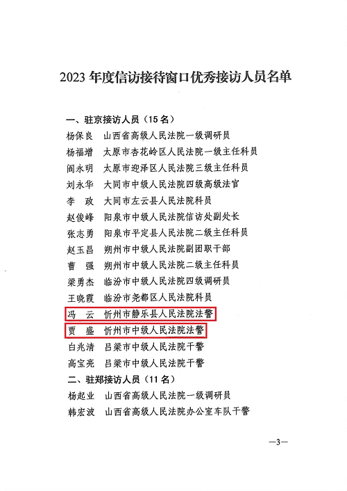 近日,山西省高級人民法院下發(fā)《關(guān)于對2023年度信訪接待窗口優(yōu)秀接訪人員予以表揚的通報》,忻州法院2名干警榜上有名。忻州中院黨組書記、院長栗向東作出批示,要求全市法院干警以受到表揚的同志為榜樣,愛崗敬業(yè),爭當(dāng)先進,爭創(chuàng)一流工作業(yè)績。