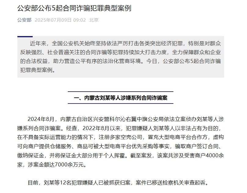 2024年8月,內(nèi)蒙古自治區(qū)興安盟科爾沁右翼中旗公安局依法立案?jìng)赊k劉某等人涉嫌系列合同詐騙案。經(jīng)查,2022年8月以來,犯罪嫌疑人劉某等人以非法占有為目的,在不具備實(shí)際運(yùn)營能力的情況下,注冊(cè)多家空殼公司,冒充大型電商平臺(tái)合作方,虛構(gòu)可向商戶提供倉儲(chǔ)服務(wù)、商品可被大型電商平臺(tái)優(yōu)先采購等事實(shí),騙取商戶簽訂合同、繳納保證金,并將保證金大部分用于個(gè)人揮霍。截至案發(fā),該案共涉及受害商戶4000余家,涉案金額達(dá)7000余萬元。