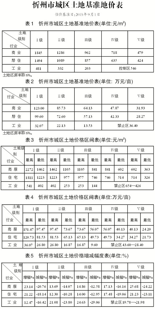 忻州市新一輪城鎮(zhèn)土地面積134.99平方公里基準地價更新工作已經(jīng)省國土資源廳組織有關專家檢查驗收。根據(jù)《山西省國土資源廳關于忻州市城鎮(zhèn)土地定級估價更新結(jié)果的批復》(晉國土資技審〔2015〕118號),現(xiàn)將忻州市城鎮(zhèn)土地基準地價予以公布實施。