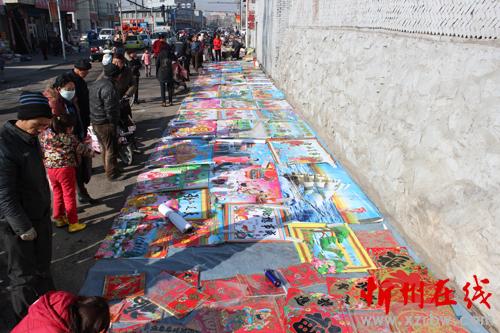 2月1日,在原平市新原鄉(xiāng)解放街村的農(nóng)貿(mào)市場上,村民們正在選購年畫。過年了,不少農(nóng)村都在集市上選購年畫、春聯(lián)、窗花、燈籠、掛件,準(zhǔn)備過個祥和喜慶的猴年春節(jié)。(曹申義 攝)