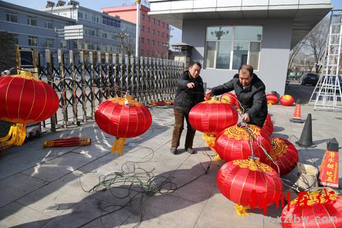 為了營(yíng)造新年喜慶祥和的節(jié)日氣氛,2月4日一早,靜樂(lè)縣政府工作人員就帶上剪刀、膠帶,扛著梯子,拿著燈籠,掛起了紅紅的燈籠,向路人們表達(dá)著新年美好的祝福。圖為工作人員正在做準(zhǔn)備工作。(閆曉梅 攝)