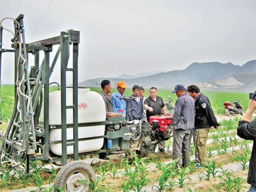 在五臺(tái)縣茹村鄉(xiāng)農(nóng)機(jī)化示范區(qū),廠方技術(shù)員正在對農(nóng)機(jī)具操作手進(jìn)行技術(shù)培訓(xùn),該示范區(qū)推廣應(yīng)用了中農(nóng)(北京)豐茂植保機(jī)械有限公司生產(chǎn)的3WX—400G 型自走式高稈作物噴稈噴霧植保機(jī)械,提升了玉米生產(chǎn)機(jī)械化程度。(鄭素平 攝)