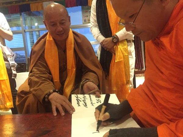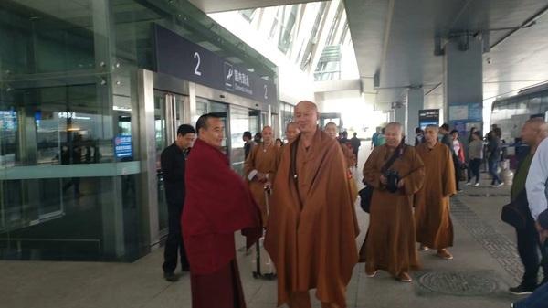 圖為五臺(tái)山望海寺住持釋覺一法師與弟子們順利到達(dá)西寧機(jī)場,木蘭加措法師前往迎接。