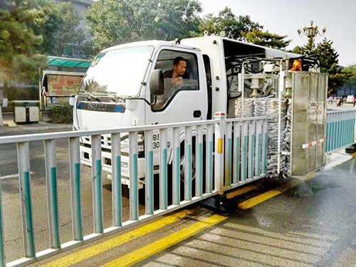交通護(hù)欄可為市民、車輛出行提供安全保障,可人工清洗護(hù)欄工作耗時(shí)耗力,還存在安全隱患。新購置的護(hù)欄清洗車通過伸縮刷子以及車載水箱噴出的水流,完成護(hù)欄清洗,工作效率遠(yuǎn)遠(yuǎn)高于人工清洗,省時(shí)又省力,效果還明顯。圖為清洗車正在對城區(qū)交通護(hù)欄進(jìn)行清洗。(張志遠(yuǎn) 孫明 攝)