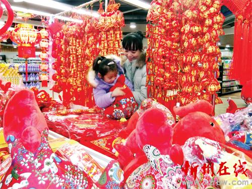 春節(jié)越來(lái)越近,我市各地迎新春氣氛越來(lái)越濃,市場(chǎng)上吉祥喜慶的商品琳瑯滿目,年味十足。1月10日,原平市一對(duì)母子正在挑選迎春飾品。(趙春曉 攝)