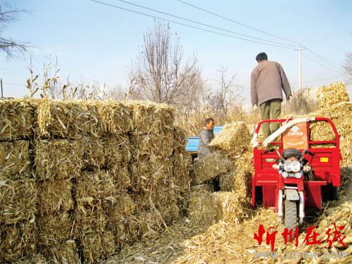 河曲縣南元村3 戶農(nóng)民購置秸稈打捆機(jī),利用冬閑時(shí)間幫助村民處理田間玉米秸稈,將其作為飼草銷售,既增加收入,又避免了因焚燒秸稈造成大氣污染,對(duì)保護(hù)環(huán)境起到了積極作用。圖為1 月18 日他們正將秸稈捆裝車,然后運(yùn)到存放場(chǎng)所碼垛。(賈金理 攝)