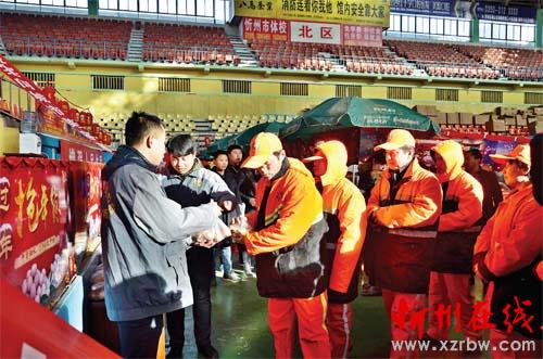 1月19日上午,山西熊奪寶網絡科技有限公司面向忻州市環(huán)衛(wèi)系統(tǒng)開展“獻愛心迎佳節(jié)”活動,來自忻州市市容環(huán)境衛(wèi)生管理處的50名環(huán)衛(wèi)工人代表,每人領到了一份新鮮雞蛋。現(xiàn)場的一位工作人員告訴記者:“環(huán)衛(wèi)工人們?yōu)榱顺鞘械母蓛粽麧嵏冻隽诵燎诘暮顾?,希望這些雞蛋能為他們補補身體。除現(xiàn)場領取雞蛋的50名環(huán)衛(wèi)工人之外,我市另外的1000多名環(huán)衛(wèi)工人也將陸續(xù)領到愛心雞蛋?!鳖I到雞蛋的環(huán)衛(wèi)工李大姐高興地說:“今年過年雞蛋也不用買了,實在是太好了!”(王菲 郭劍鳴 攝)