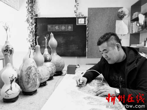 在定襄縣,有一個(gè)叫王燕軍的后生,他的愛(ài)好比較獨(dú)特,常手持一把小烙鐵,在葫蘆上熨出烙痕作畫,大家都親切地喊他“葫蘆娃”。王燕軍的這種工藝叫烙畫,又稱燙畫、火種刺繡、火筆畫,起源于漢代,興于唐宋,是一類極其珍貴的畫種。