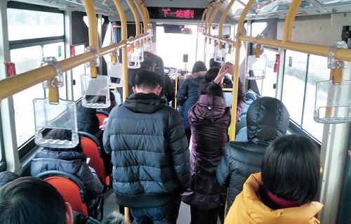 近日,我市發(fā)布重污染天氣橙色預(yù)警,忻州城區(qū)機動車實行單雙號限行。限行期間,城市公交車加大運營力度,為出行市民提供免費服務(wù)。圖為1月10日上午,306路公交車上內(nèi)景。魯明強 攝