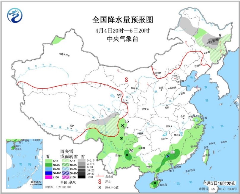 4月4日20時至5日20時,黑龍江中南部、吉林東北部、內(nèi)蒙古東北部、西藏東部、川西高原中北部等地的部分地區(qū)有小到中雨或雨夾雪,其中黑龍江中部局地有大雪。江西南部、湖南南部、廣東北部和西部、海南島大部、云南東部等地的部分地區(qū)有中雨,局地大雨。內(nèi)蒙古西部、寧夏北部、陜西北部等地的部分地區(qū)有揚沙或浮塵天氣。西北地區(qū)東北部、華北北部、東北地區(qū)南部有4~6級風。
