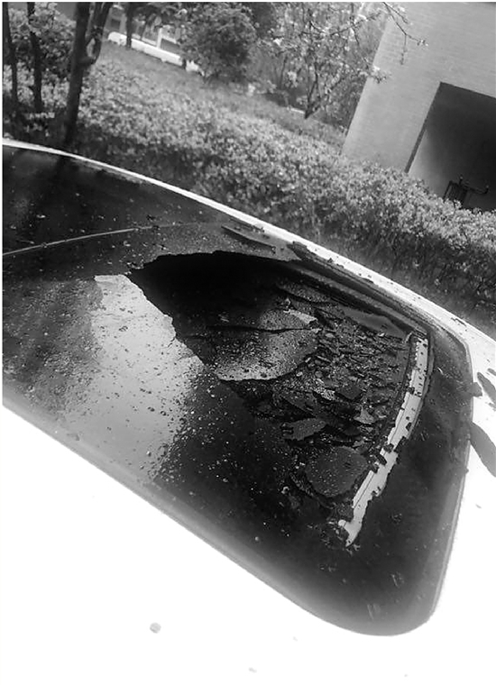 李師傅說(shuō):“3月29日一大早,我女兒送孩子上學(xué),車(chē)子就停在15幢樓下。我女兒自己都沒(méi)發(fā)現(xiàn),準(zhǔn)備開(kāi)車(chē)走了。外孫女坐在后座,她說(shuō)媽媽?zhuān)覀冘?chē)頂怎么有個(gè)窟窿了。我女兒下車(chē)一看,驚呆了,馬上給我打電話(huà)?!?/p>
