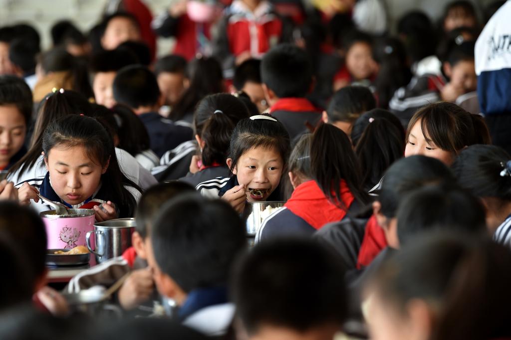 ↑這是學生們在食堂吃午餐(4月16日攝)。新華社記者詹彥攝