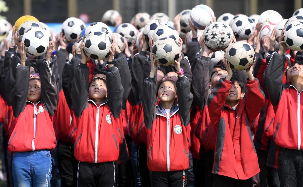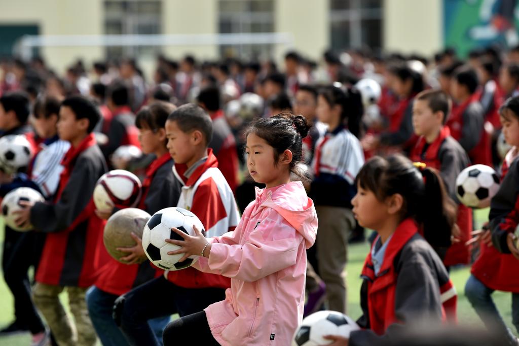 ↑這是學生們準備做足球操(4月18日攝)。新華社記者李俊東攝