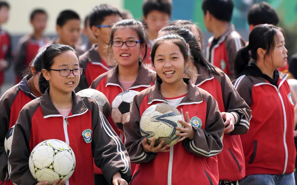 ↑這是學生們在做足球操(4月18日攝)。新華社記者詹彥攝