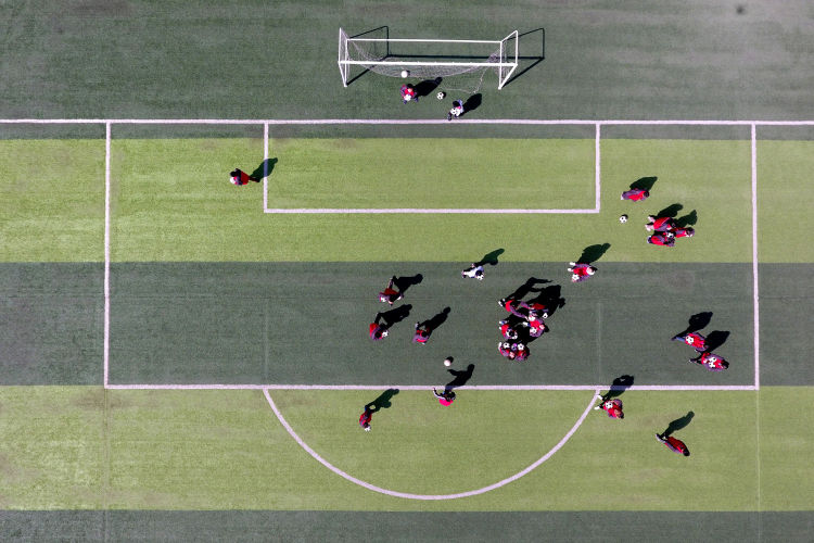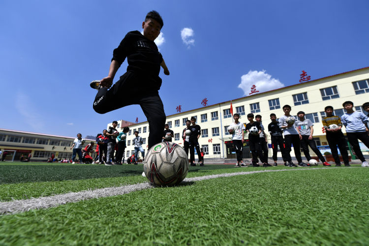 ↑這是初中學(xué)生在足球場(chǎng)上練習(xí)射門(mén)(4月16日攝)。新華社記者詹彥攝
