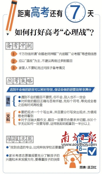 距離高考不足10天,張敏強認為,此時探究學習方法、學習新知識已不現(xiàn)實,也難以在短時間有明顯成效,關(guān)鍵是要做好考前心理調(diào)適以及掌握應考技巧。張敏強不建議考生做新的題目,而是要把之前做過的題目鞏固記憶。他提醒考生,千萬勿信所謂的“命題老師押題”等虛假信息,“命題人員的身份是絕密的,即便是命題老師也不會知道試卷上最終使用了哪一道題目?!?/p>