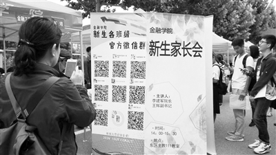 9月1日,中央財經(jīng)大學新生報到現(xiàn)場,金融學院的學生邀請新生掃碼入群。李涓 攝