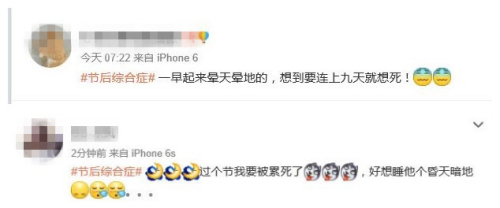 自2015年2月至今,新浪微博“#節(jié)后綜合癥#”的話題主頁持續(xù)有新帖發(fā)布,總閱讀量超過1000萬。節(jié)后第一天尚未到來,已經(jīng)有網(wǎng)友發(fā)帖抱怨“一早起來暈天暈地的”“好想睡他個(gè)昏天暗地”。
