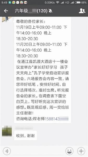 老師在班級(jí)微信群里發(fā)信息通知家長(zhǎng)聽(tīng)講座