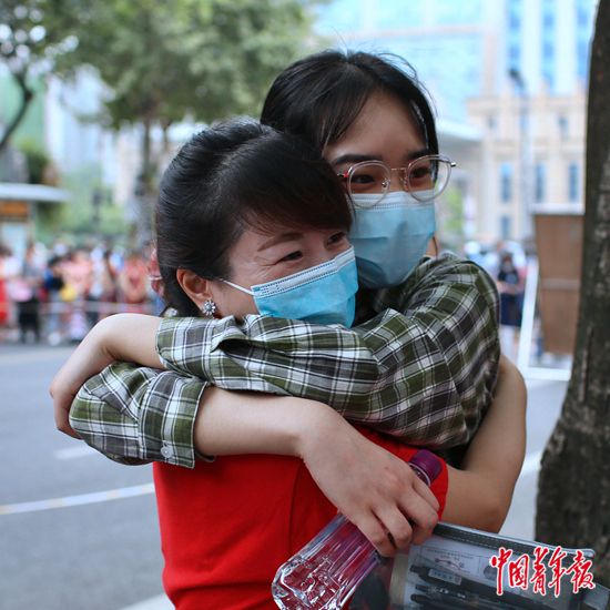 7月7日上午,四川省成都市,成都七中考點(diǎn)門口,一名考生進(jìn)入考場(chǎng)前與老師擁抱。汪龍華/攝