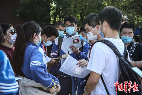 7月7日上午,北京市中國人民大學(xué)附屬中學(xué)朝陽學(xué)校(東校區(qū))門口,考生們?cè)谶M(jìn)入考場(chǎng)前抓緊時(shí)間看復(fù)習(xí)資料。中青報(bào)·中青網(wǎng)見習(xí)記者 孔斯琪/攝