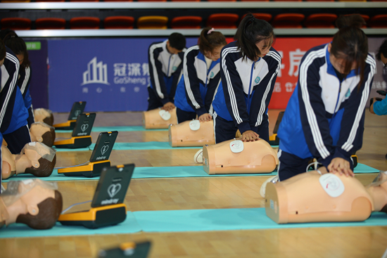 青年學(xué)生進(jìn)行心肺復(fù)蘇操作學(xué)習(xí)。陳政/攝