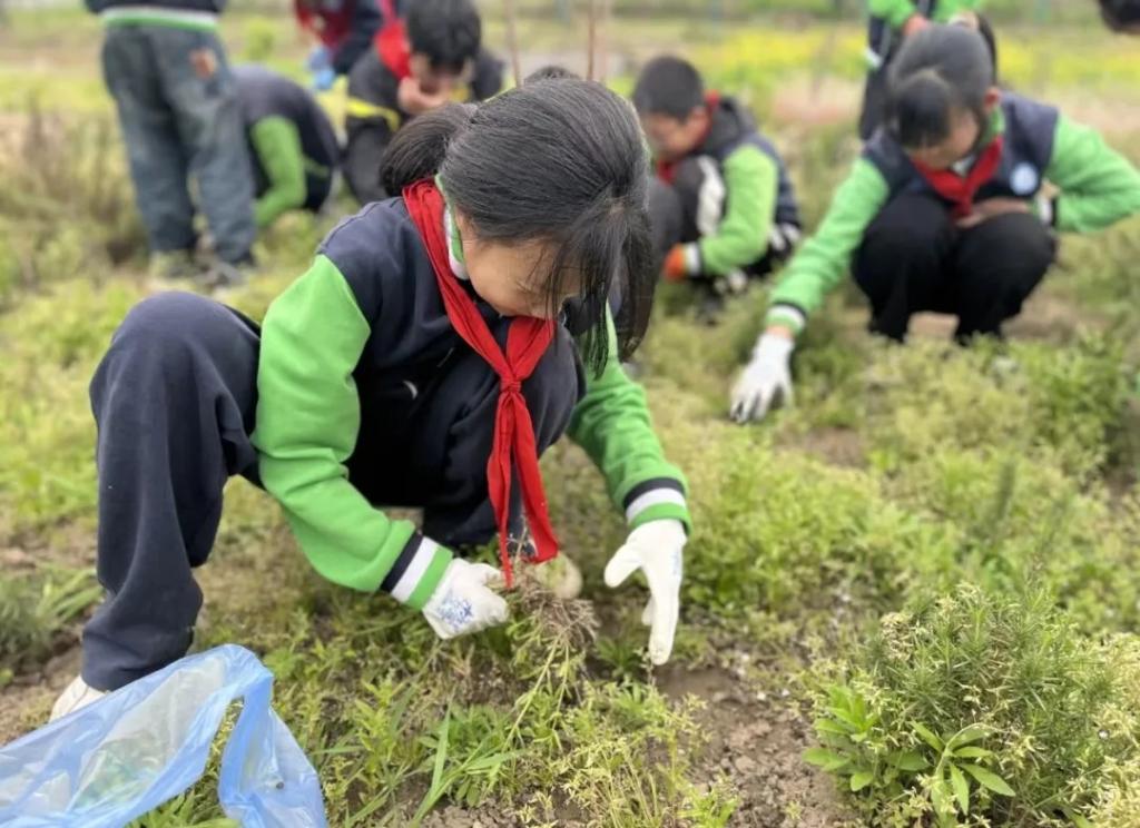 4月16日,南京市力行小學(xué)的同學(xué)們?cè)谒幹矆@里除草勞動(dòng)。(力行小學(xué)供圖)