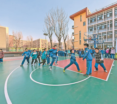 新學(xué)期開學(xué),北京、合肥、上海、深圳等地的多所中小學(xué)將每天一節(jié)體育課設(shè)為標配,并將課間從10分鐘延長至15分鐘。在安徽省合肥市青年路小學(xué)的一堂體育課上,學(xué)生們正進行跳繩比賽。幾輪比拼后,孩子們臉蛋紅撲撲的,額頭冒汗,成績一次比一次好。