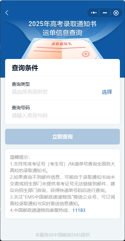 考生可以通過國務院客戶端小程序,進行高考錄取通知書運單信息查詢。?