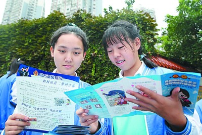 9月15日,四川省內(nèi)江市東興初級中學(xué)學(xué)生正在閱讀網(wǎng)絡(luò)安全宣傳資料。蘭自濤攝/光明圖片