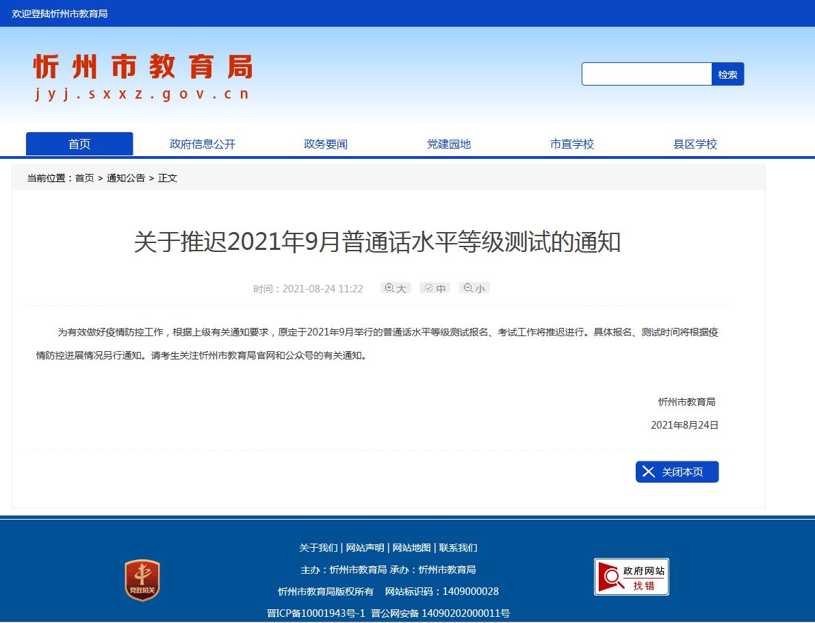 為有效做好疫情防控工作,根據(jù)上級有關(guān)通知要求,原定于2021年9月舉行的普通話水平等級測試報(bào)名、考試工作將推遲進(jìn)行。具體報(bào)名、測試時(shí)間將根據(jù)疫情防控進(jìn)展情況另行通知。請考生關(guān)注忻州市教育局官網(wǎng)和公眾號的有關(guān)通知。
