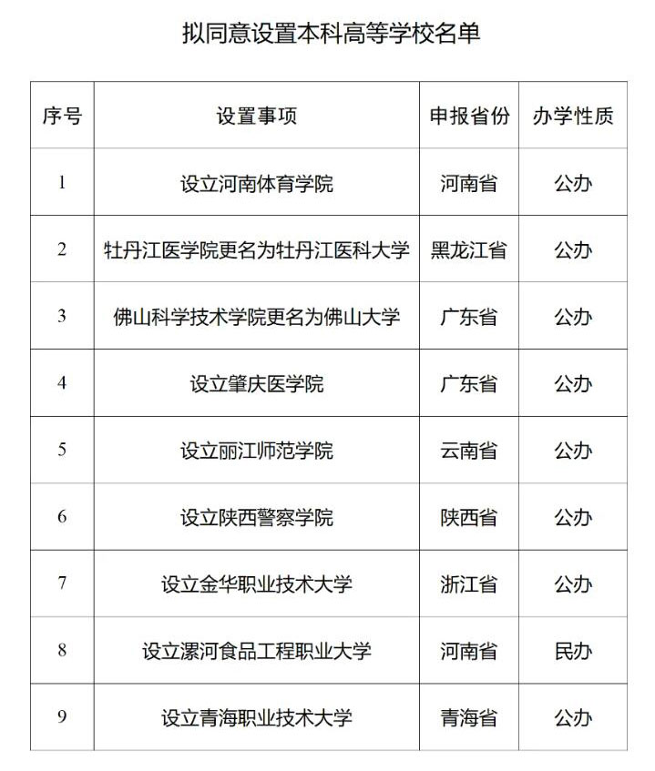 根據(jù)《中華人民共和國高等教育法》《普通高等學(xué)校設(shè)置暫行條例》《普通本科學(xué)校設(shè)置暫行規(guī)定》《本科層次職業(yè)學(xué)校設(shè)置標(biāo)準(zhǔn)(試行)》等有關(guān)規(guī)定以及第八屆全國高等學(xué)校設(shè)置評(píng)議委員會(huì)考察評(píng)議結(jié)果,經(jīng)教育部黨組會(huì)議審議,擬同意設(shè)置河南體育學(xué)院等9所學(xué)校,現(xiàn)予公示。其中,2所高校更名,7所高校為新設(shè)。