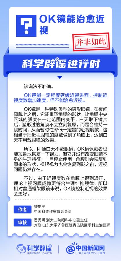 OK鏡能一定程度延緩近視進(jìn)程,控制近視度數(shù)增加速度,但不能治愈近視。OK鏡是一種特殊類型的隱形眼鏡,在夜間佩戴上之后,它能重塑角膜的形狀,讓角膜中央?yún)^(qū)域的弧度在一定范圍內(nèi)變平,白天取下鏡片后,塑形過的角膜不會(huì)立刻復(fù)原,而是會(huì)維持一段時(shí)間,從而暫時(shí)性降低一定量的近視度數(shù)。但它并沒有改變眼睛本身的生理特征,一旦停止使用,角膜則會(huì)恢復(fù)到原來的形狀,裸眼視力也會(huì)恢復(fù)到戴之前。(來源:@科學(xué)辟謠中國新聞網(wǎng)微博 )