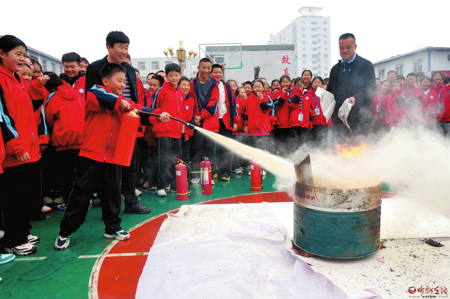 為了提升學(xué)校火災(zāi)疏散組織和管理能力,強(qiáng)化師生安全意識,培養(yǎng)師生的自救能力,10月31日,忻州市第七中學(xué)舉行消防應(yīng)急疏散演練。圖為學(xué)生使用滅火器滅火。(張卯芳 攝)
