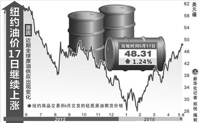近期,國際原油價格屢現(xiàn)攀升,逼近每桶50美元。5月17日,截至當日收盤,紐約商品交易所6月交貨的輕質(zhì)原油期貨價格上漲0.59美元,收于每桶48.31美元,漲幅為1.24%。7月交貨的倫敦布倫特原油期貨價格上漲0.31美元,收于每桶49.28美元,漲幅為0.63%。分析認為,一些突發(fā)因素導(dǎo)致了近期油價攀升,國際油市實現(xiàn)供需平衡仍需時日。