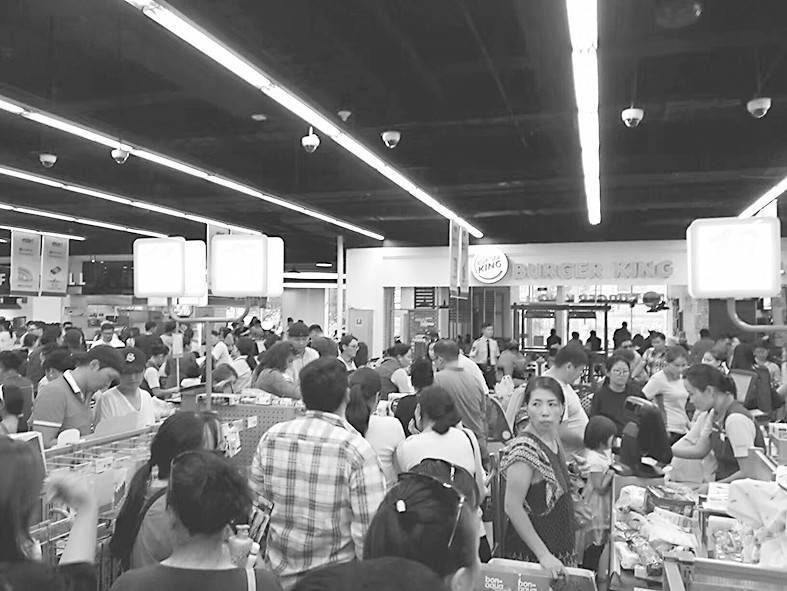 圖片說(shuō)明: 烏蘭巴托8月初開業(yè)的一家韓國(guó)商場(chǎng)收銀臺(tái)前人滿為患,絲毫沒有危機(jī)氛圍。楊濤攝