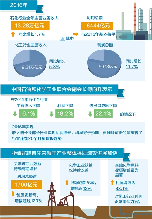來自中國(guó)石油和化學(xué)工業(yè)聯(lián)合會(huì)的信息顯示,2016年,石化行業(yè)全年主營(yíng)業(yè)務(wù)收入13.28萬億元,同比增長(zhǎng)1.7%,利潤(rùn)總額6444億元,與2015年基本持平;其中化工行業(yè)主營(yíng)收入9.21萬億元、同比增長(zhǎng)5.3%,利潤(rùn)總額5073億元、同比增長(zhǎng)11.7%。中國(guó)石油和化學(xué)工業(yè)聯(lián)合會(huì)副會(huì)長(zhǎng)傅向升表示,在2015年石化全行業(yè)主營(yíng)收入下降6.1%、利潤(rùn)下降18.2%、進(jìn)出口總額下降22.1%的情況下,2016年實(shí)現(xiàn)收入增長(zhǎng)及部分行業(yè)實(shí)現(xiàn)利潤(rùn)增長(zhǎng),結(jié)果好于預(yù)期。更難能可貴的是,扭轉(zhuǎn)了行業(yè)連續(xù)20個(gè)月負(fù)增長(zhǎng)趨勢(shì)。