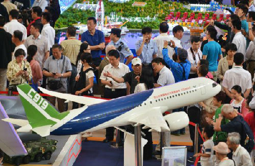 2016年6月7日,觀眾在國家“十二五”科技創(chuàng)新成就展上參觀國產(chǎn)C919飛機(jī)模型。(新華社)
