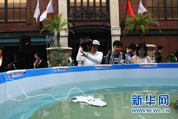 發(fā)布會場外舉行了PowerRay的水中操作演示。新華網(wǎng)記者 華義 攝