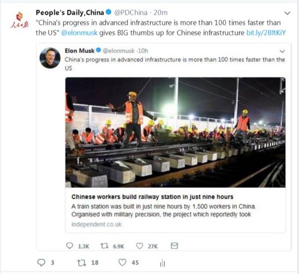 央廣網(wǎng)北京2月28日消息 近年來,中國速度日益引發(fā)外媒關(guān)注。今天(28日),一段中國工人在火車站施工的視頻又走紅美國,剛剛將跑車送上太空的企業(yè)家馬斯克(Elon Musk)也忍不住轉(zhuǎn)發(fā)贊嘆,“中國先進(jìn)基礎(chǔ)設(shè)施發(fā)展速度比美國快了100多倍”。