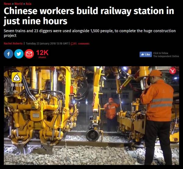 報道以《中國工人建火車站只要9個小時》為標(biāo)題,并稱中國的先進(jìn)基建工程讓人“嘆為觀止”。