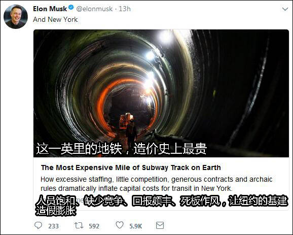 馬斯克不僅發(fā)火箭、造汽車,他旗下的Boring公司,正著手通過“鼴鼠計劃”(鋪設(shè)地下高速公路),試圖改善美國這兩個地方的交通。彭博社曾表示,馬斯克也算是深知美國基建行業(yè)的業(yè)內(nèi)人士。
