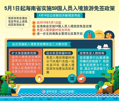 “擴(kuò)大免簽國(guó)范圍;延長(zhǎng)免簽停留時(shí)間;放寬免簽人數(shù)限制。”4月18日,公安部在京召開(kāi)新聞發(fā)布會(huì),國(guó)家移民管理局在發(fā)布會(huì)上通報(bào):經(jīng)國(guó)務(wù)院批準(zhǔn),自2018年5月1日起,在海南省實(shí)施59國(guó)人員入境旅游免簽政策,進(jìn)一步支持海南全面深化改革開(kāi)放。