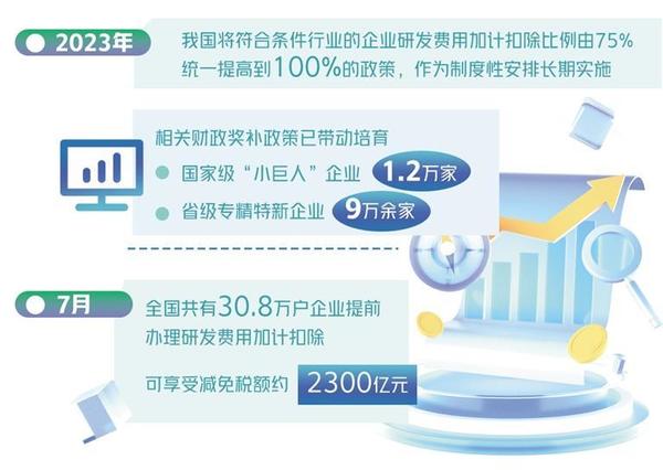“為切實保證這一新的惠企政策落實到位,稅務(wù)部門依托稅收大數(shù)據(jù)篩選符合條件的企業(yè),定向開展政策精準推送和宣傳輔導(dǎo),確保企業(yè)‘知曉政策’;會同科技部門及時發(fā)布《研發(fā)費用加計扣除政策執(zhí)行指引2.0》,細化政策口徑,確保企業(yè)‘會用政策’;第一時間優(yōu)化升級征管系統(tǒng),改進電子稅務(wù)局功能,讓納稅人‘足不出戶’即可快捷辦理,確保企業(yè)‘用好政策’?!眹叶悇?wù)總局新聞發(fā)言人、辦公廳主任黃運介紹。從7月份政策落實情況看,全國共有30.8萬戶企業(yè)提前辦理研發(fā)費用加計扣除,可享受減免稅額約2300億元。