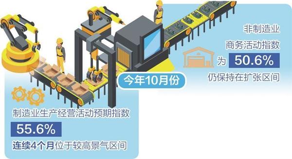從市場預(yù)期看,10月份,制造業(yè)生產(chǎn)經(jīng)營活動預(yù)期指數(shù)為55.6%,比上月上升0.1個百分點(diǎn),連續(xù)4個月位于較高景氣區(qū)間,制造業(yè)企業(yè)對市場發(fā)展信心穩(wěn)定。