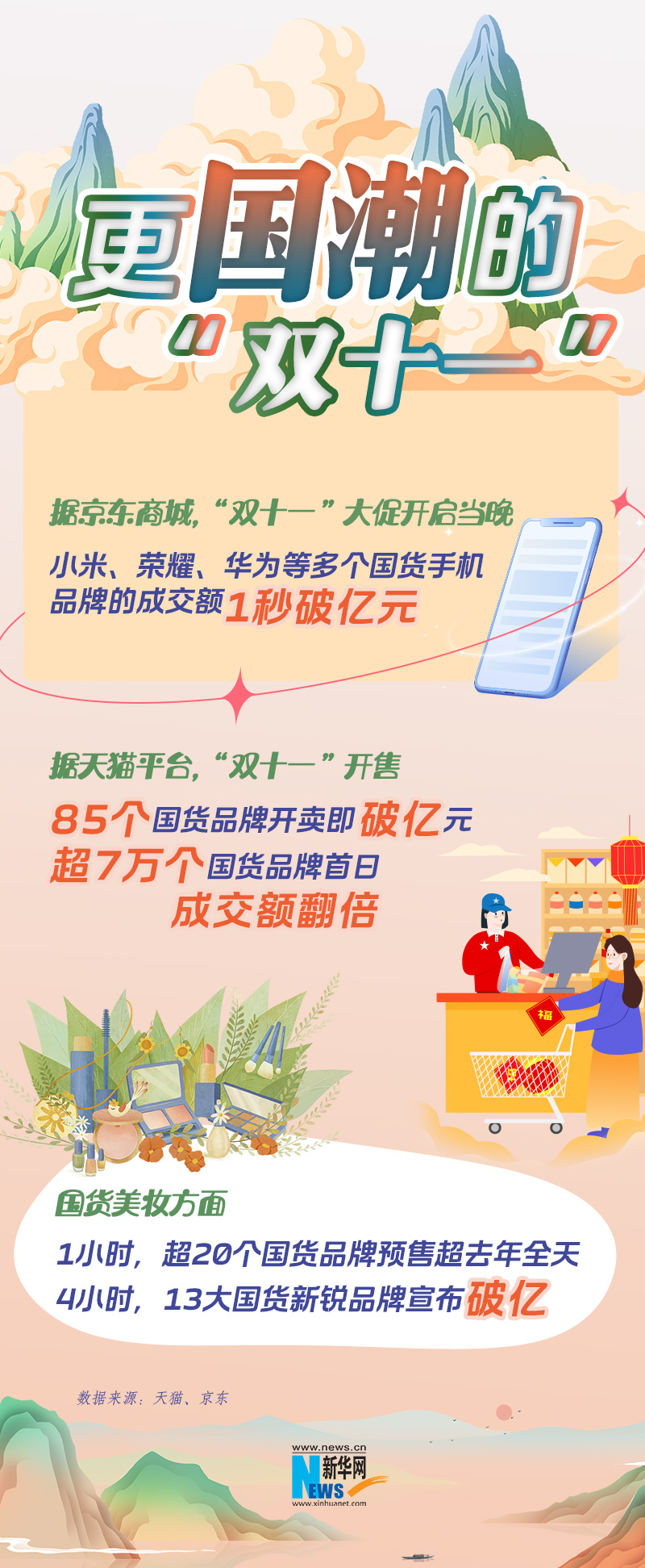 公開數據顯示,10月23日京東“雙十一”開啟當晚,小米、榮耀、華為等多個國貨手機品牌的成交額1秒破億元;10月31日晚天貓“雙十一”正式開售,85個國貨品牌開賣即破億元,超7萬個國貨品牌首日成交額翻倍。