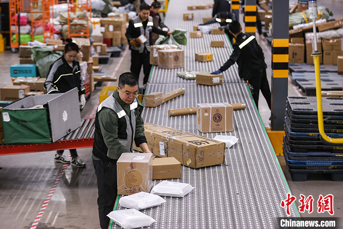 資料圖為2023年11月12日,工作人員在貴州順豐一中轉場分揀快遞。中新社記者 瞿宏倫 攝
