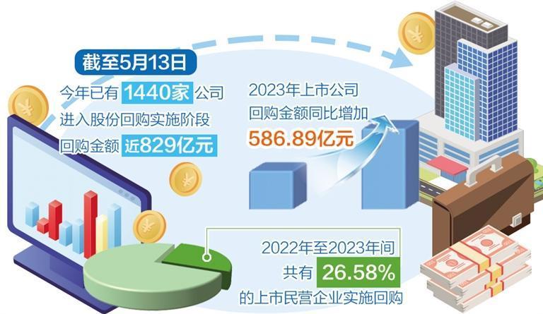 A股上市公司股份回購熱持續(xù)升溫。Wind數(shù)據(jù)顯示,截至5月13日,今年已有1440家公司進(jìn)入股份回購實施階段,合計回購金額近829億元,遠(yuǎn)超去年同期的247億元。中國上市公司協(xié)會數(shù)據(jù)顯示,2023年上市公司回購金額同比增加586.89億元,增長108.82%。