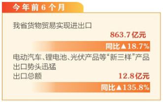 本報(bào)訊(記者孟婷)7月31日,記者從太原海關(guān)獲悉,據(jù)統(tǒng)計(jì),今年前6個(gè)月,我省貨物貿(mào)易實(shí)現(xiàn)進(jìn)出口863.7億元,同比增長(zhǎng)18.7%,與此同時(shí),電動(dòng)汽車、鋰電池、光伏產(chǎn)品等“新三樣”產(chǎn)品出口勢(shì)頭迅猛,出口總額12.8億元,同比增長(zhǎng)135.8%,遠(yuǎn)超傳統(tǒng)出口商品。這些高科技產(chǎn)品不僅代表山西制造業(yè)轉(zhuǎn)型升級(jí)的最新成果,也為山西在國(guó)際市場(chǎng)競(jìng)爭(zhēng)中贏得了新優(yōu)勢(shì)。