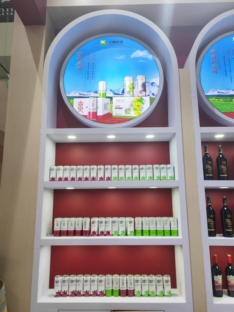 寧夏農(nóng)墾酒業(yè)有限公司在賀蘭山東麓國際葡萄酒交易會(huì)上展示的易拉罐裝葡萄酒。新華社記者 艾福梅 攝